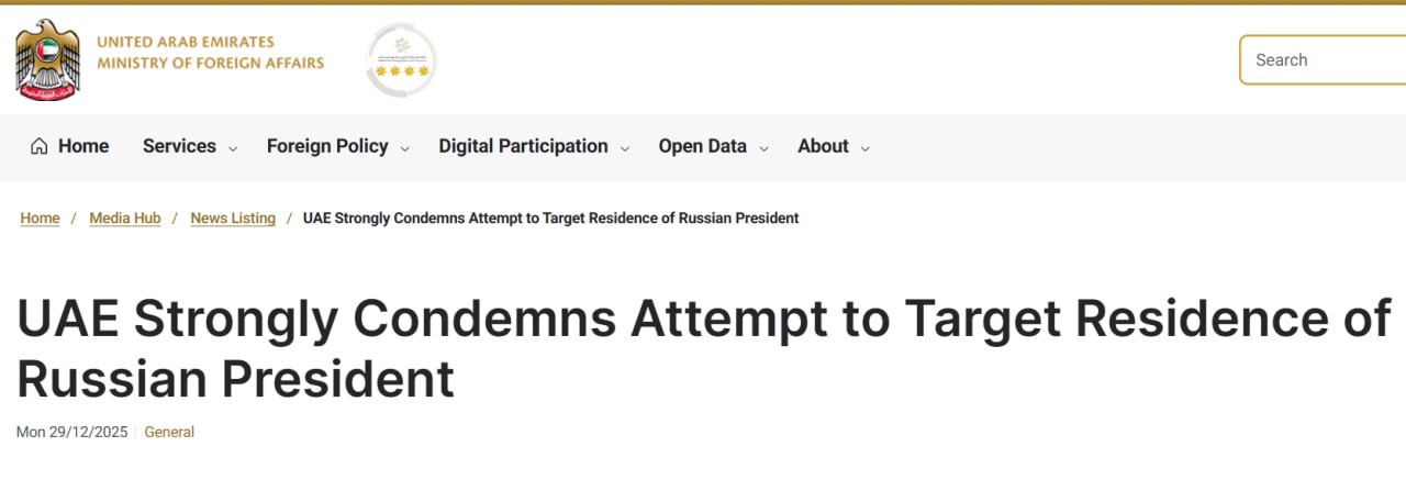 "Объединенные Арабские Эмираты решительно осудили попытку нападения на резиденцию Его превосходительства Владимира Путина, президента Российской Федерации, и осудили это прискорбное нападение и угрозу, которую оно представляет для безопасности и стабильности. В своем заявлении Министерство иностранных дел (МИД) подтвердило солидарность ОАЭ с президентом Российской Федерации, а также с правительством и народом России. Министерство вновь подчеркнуло непоколебимое неприятие ОАЭ всех форм насилия, направленных на подрыв безопасности и стабильности", – говорится в заявлении на сайте МИД.