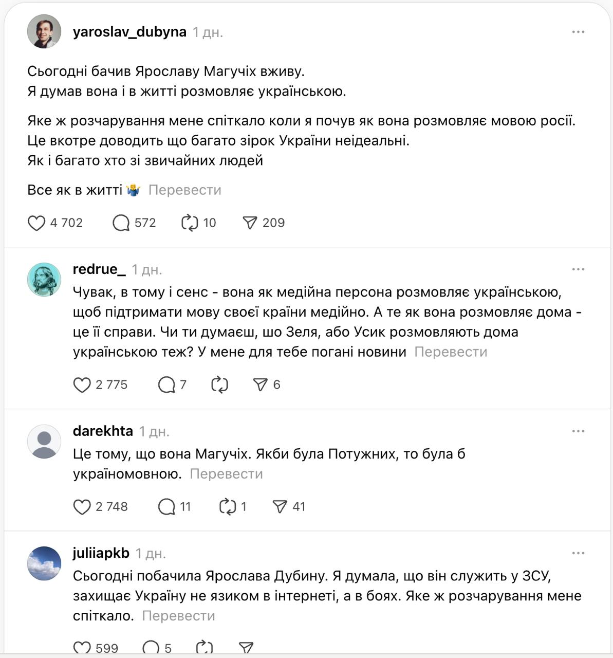 За Магучих заступился бизнесмен Гарик Корогодский. Он написал, что дома тоже общается только на русском, хотя в публичной сфере полностью перешёл на украинский.
