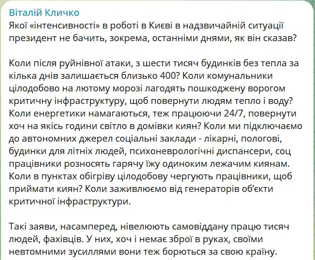 "Какой "интенсивности" в работе в Киеве в чрезвычайной ситуации президент не видит, в частности, в последние дни, как он сказал?" - задается вопросом Кличко.