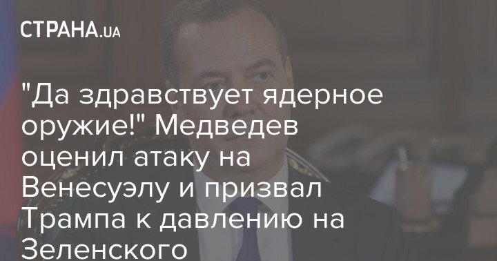 Заместитель председателя Совбеза РФ Дмитрий Медведев прокомментировал атаку США на Венесуэлу с похищением президента Николаса Мадуро и призвал главу Белого дома Дональда Трампа применить этот опыт к украинскому президенту Владимиру Зеленскому.