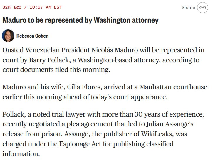 Ранее СМИ сообщали, что Николаса Мадуро на первом судебном заседании будет представлять государственный защитник. Однако за час до начала слушания стало известно, что президент Венесуэлы нанял адвоката из Вашингтона Барри Поллака с более чем 30 годами опыта.