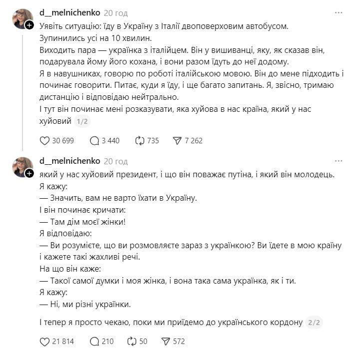 "Представьте ситуацию: еду в Украину из Италии двухэтажным автобусом. Остановились на десять минут. Выходит пара - украинка с итальянцем. Он в вышиванке, которую, как он сказал, ему подарила его любимая, и они вместе едут к ней домой. Я в наушниках, говорю по работе на итальянском языке. Он ко мне подходит и начинает говорить. Спрашивает, куда я еду, и еще много вопросов. Я, конечно, держу дистанцию ​​и отвечаю нейтрально. И тут он начинает мне рассказывать, какая х@евая у нас страна, какой у нас х@евый президент, и что он уважает Путина, и какой тот молодец.