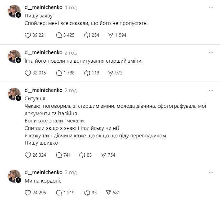 Пока автобус направлялся к украинской границе, пост Мельниченко завирусился, видимо, его прочитали и пограничники. И когда автобус прибыл на пункт пропуска, работники Чопского пограничного отряда пригласили гражданина Италии для беседы. В результате, как сообщила автор записи, в Украину его не пустили.