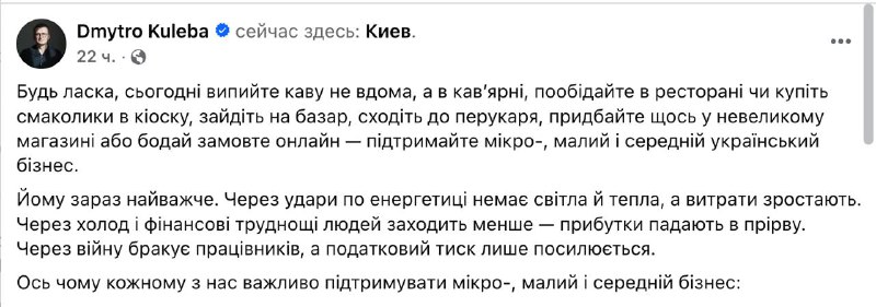 Ему сейчас тяжелее всего. Из-за ударов по энергетике нет света и тепла, а расходы растут. Из-за холода и финансовых трудностей людей заходит меньше, доходы падают в бездну. Из-за войны не хватает работников, а налоговое давление только усиливается", - написал Кулеба.