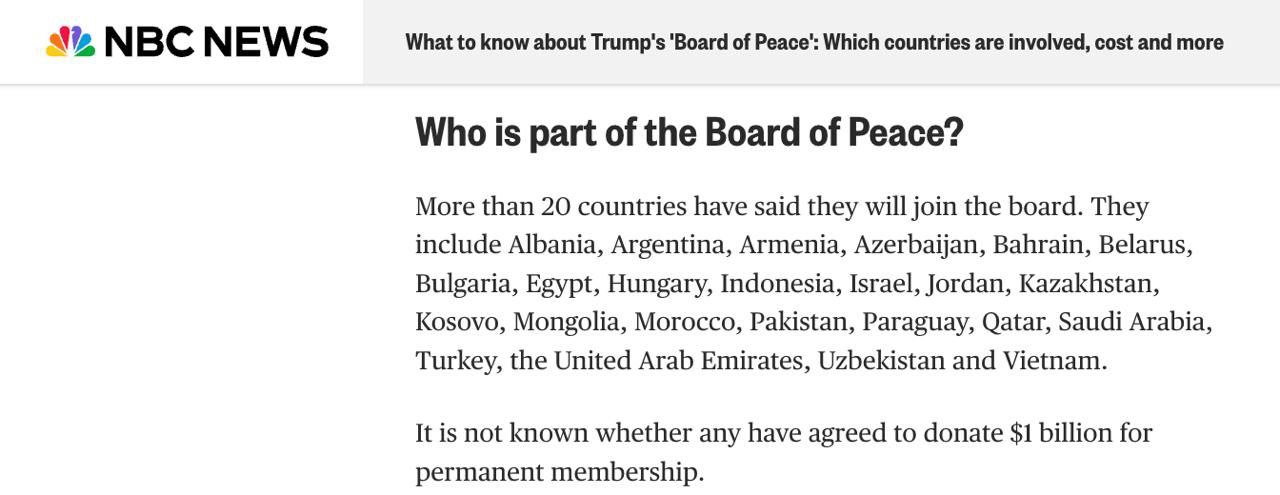 Телеканал NBC News в сегодняшней статье сообщил, что согласие войти в совет помимо США, дали 24 страны: Албания, Аргентина, Армения, Азербайджан, Бахрейн, Беларусь, Болгария, Египет, Венгрия, Индонезия, Израиль, Иордания, Казахстан, Косово, Монголия, Марокко, Пакистан, Парагвай, Катар, Саудовская Аравия, Турция, Объединённые Арабские Эмираты, Узбекистан и Вьетнам.