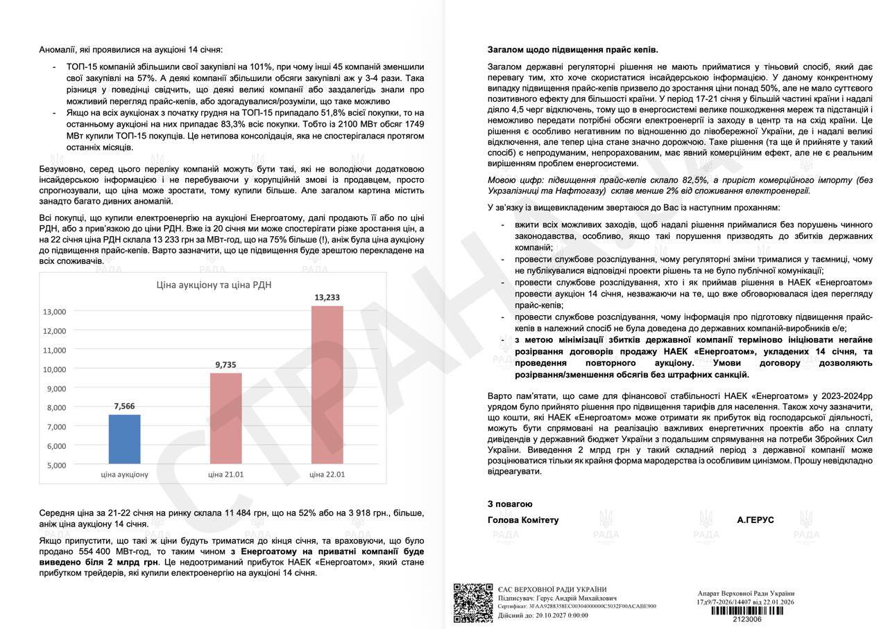 Также публикуется письмо руководителям страны от главы парламентского комитета по ТЭК Андрея Геруса о ситуации с резким повышением цен на электроэнергию для промышленности.