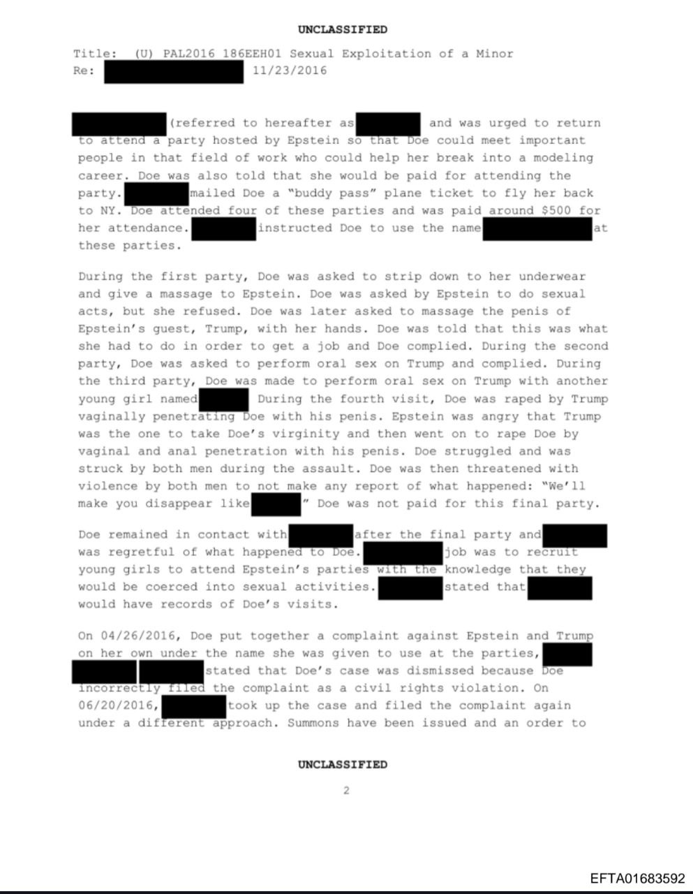 Она утверждала, что летом 1994 года ее, тогда 13-летнюю девочку, заманили в Нью-Йорк под предлогом возможностей в модельном бизнесе. Там она якобы посещала вечеринки, организованные Эпштейном, и была принуждена к сексуальным актам как с Эпштейном, так и с Трампом - включая массаж, оральный секс и изнасилование.