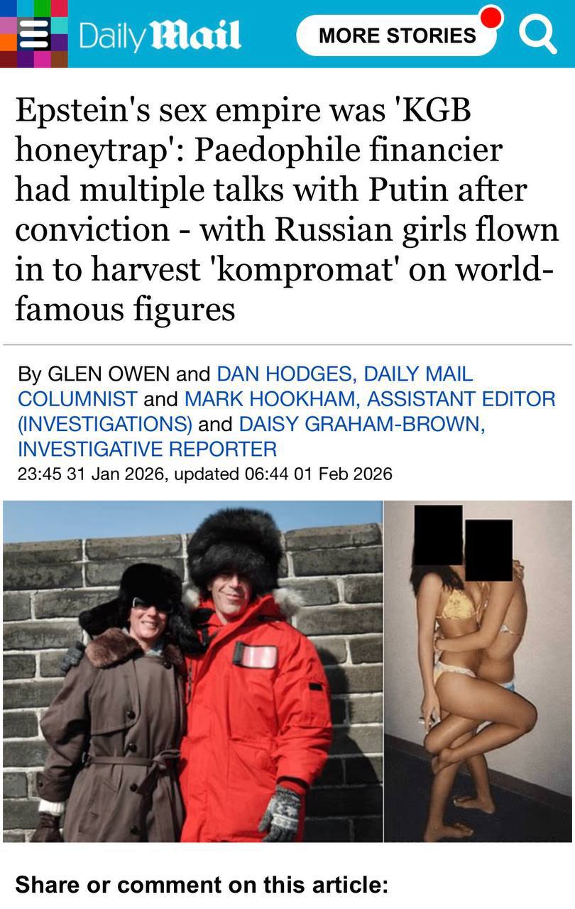 "Публикация более трех миллионов новых документов, касающихся сексуального преступника, подтверждает заявления высокопоставленных сотрудников служб безопасности о том, что Эпштейн действовал в интересах Москвы, когда организовывал встречи для некоторых из самых влиятельных людей мира.