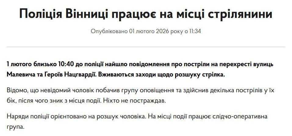 В Виннице неизвестный открыл огонь по группе оповещения территориального центра комплектования, обошлось без пострадавших.