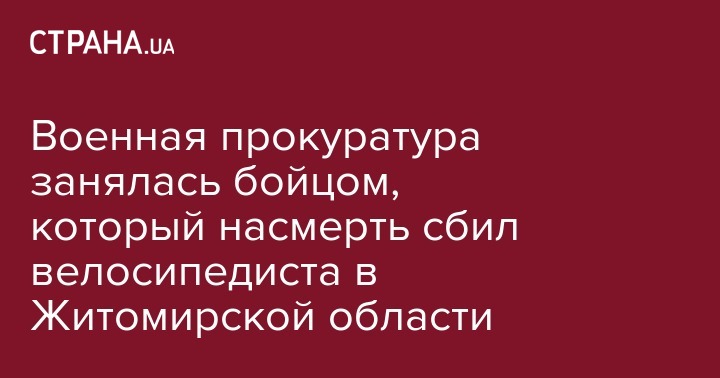 Сотрудники военной прокуратуры Житомирского гарнизона Центрального региона Украины занялись процессуальным руководством в уголовном производстве по факту смерти велосипедиста. Его сбил управлявший легковым автомобилем военнослужащий из Житомирской области.