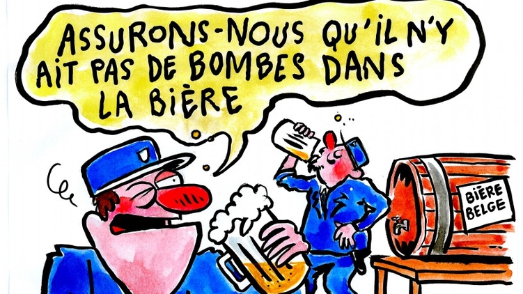 На ней изображены пьяные бельгийские полицейские, которые пьют пиво из бокалов. Сама карикатура сопровождается таким заголовком - "Теракты: Бельгия принимает меры".