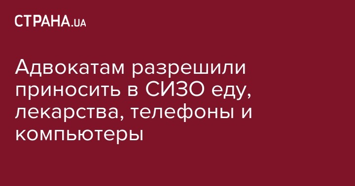 Министр юстиции Павел Петренко своим приказом разрешил адвокатам приносить в СИЗО лекарственные препараты для лечения заключенных, еду, компьютеры и телефоны. О этом сообщает Совет адвокатов Киевской области на своем сайте.