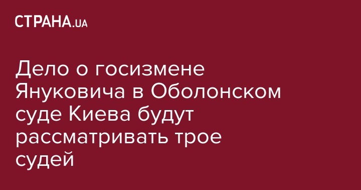 Дело экс-президента Виктора Януковича сегодня поступило в Оболонский райсуд Киева и его будет рассматривать коллегия из трех судей. В составе коллегии председатель суда Владислава Девятко, его заместитель Дмитрия Камбулова и судья гражданско-административной коллегии судей Максим Титов. Об этом сообщила пресс-секретарь суда Инна Свинаренко, передает "Интерфакс-Украина".