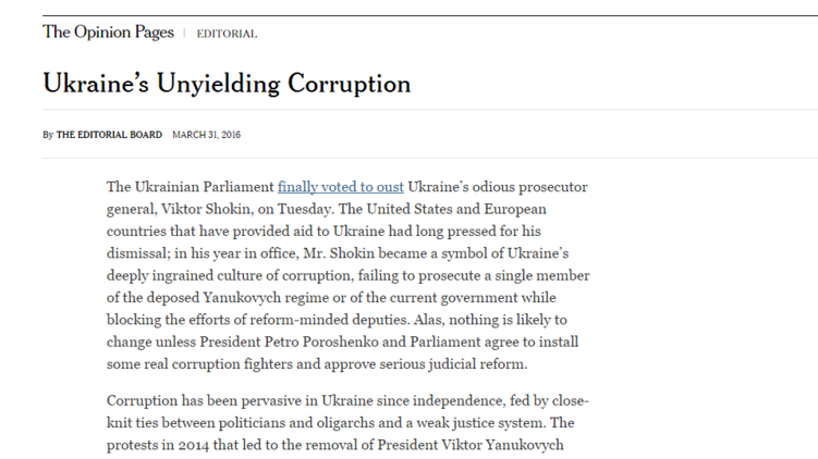 "Украинский парламент наконец-то проголосовал за то, чтобы уволить одиозного генпрокурора Виктора Шокина. США и европейские страны, которые оказали помощь Украине, давно выступали за его увольнение. Во время пребывания на посту, Шокин стал символом Украины, в которой глубоко укоренилась культура коррупции, не было осуществлено ни одного судебного преследования ни соратников свергнутого Януковича, ни нынешнего правительства, блокировались все усилия реформистски настроенных депутатов", - говорится в редакционной статье.