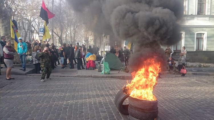 Около половины пятого вечера в Одессе под областной прокуратурой, что на Дерибасовской, активисты, которые протестуют против нового областного прокурора Николая Стоянова, подожгли покрышки.