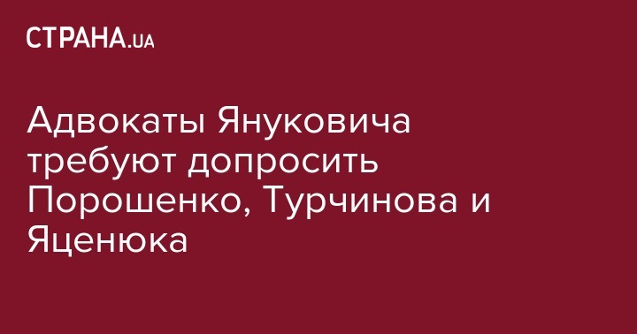 Адвокаты Виктора Януковича в рамках дела по обвинению экс-президента будут ходатайствовать о допросе президента Петра Порошенко, секретаря СНБО Александра Турчинова и экс-премьера Арсения Яценюка. Об этом сегодня заявил адвокат Януковича Виталий Сердюк, пишет "Украинская правда".