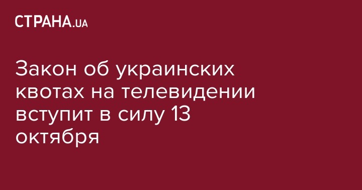 Закон про квоты на украинский язык в 75% на общенациональных телеканалах вступит в силу 13 октября. Закон сегодня уже опубликован в официальной газете Верховной Рады "Голос Украины" и вступает в силу через 4 месяца со дня опубликования.