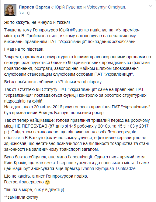В Генпрокуратуре подтвердили информацию СМИ, что глава ГПУ Юрий Луценко на прошлой неделе направил на имя премьер-министра Владимира Гройсмана письмо, где отмечалась ненадлежащее исполнение тогда еще главой "Укрзализныця" Войехом Балчунов возложенных обязательств, в связи с чем в ГПУ просили контракт с ним не продлевать. Информацию подтвердила в Facebook пресс-секретарь Луценко Лариса Сарган.