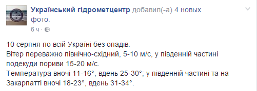 "10 августа по всей Украине без осадков. Ветер северо-восточный, 5-10 м/с, в южной части кое-где порывы 15-20 м/с. Температура ночью 11-16°, днем 25-30°, в южной части и на Закарпатье ночью 18-23 °, днем 31-34°", - говорится в сообщении.