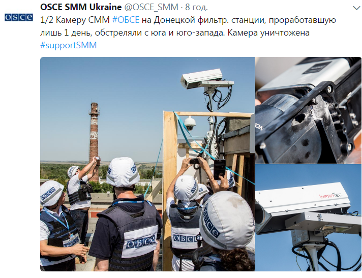 "Камеру СММ ОБСЕ на Донецкой фильтр. станции, проработавшую лишь 1 день, обстреляли с юга и юго-запада. Камера уничтожена", - говорится в сообщении опубликованном в twitter-микроблоге миссии СММ ОБСЕ в среду, 8 августа. Также были представлены фотографии поврежденной камеры.