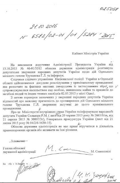 Подпись, которую Саакашвили передал изданию, оставлена кириллицей. Ее он сделал под письмом Кабмину, в котором отчитывается об обращении нардепа Сольвара о причастности мэра Одессы Труханова к трагедии 2 мая в Одессе.