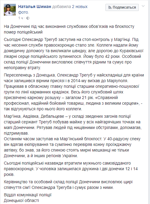 "Марьинка, Авдеевка, Дебальцево - в составе сводных отрядов полиции старший сержант Трегуб побывал почти во всех горячих точках на карте Донецкой области. Спасал людей под сокрушительными обстрелами, помогал, поддерживал. В последнее время был на Марьинском блокпосту. В 40-градусную жару он надевал экипировку и добросовестно проверял каждую проезжающую машину, зная, что за его спиной стоят мирные жители не только Донбасса, но и других регионов Украины", - пишут в полиции.