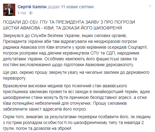 "Обратился в Службу безопасности Украины, другие силовые органы, к президенту Украины, чтобы там отреагировали на неоднократные угрозы советника Авакова Ильи Кивы утопить в крови руководителей ячеек Соцпартии, угрозы расправы над действующим руководством СПУ и СДП, народными депутатами Украины. Особенно волнуют его фашистские заявления и постоянные высказывания по подготовке Аваковым госпереворота. Еще раз, отдельно прошу обратить внимание на многочисленные призывы к государственному перевороту. Учитывая выводы медиков о психическом состоянии аваковского приспешника призываю провести все мероприятия в кратчайшие сроки, ведь шизофренические состояния могут быть причиной безосновательной агрессии, а следовательно, Кива потенциально опасен для окружающих. Прошу силовиков обеспечить защиту адресатов от его угроз. Кроме того, требую по результатам проверки лишить его, как человека с острым расстройством личности по шизофреническом типа и инвалида 2 группы, погон и разрешений на оружие", - написал нардеп.