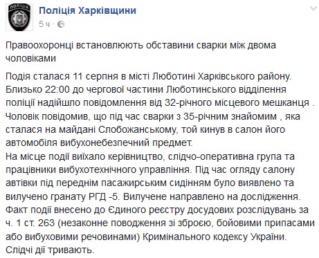 "В Люботине Харьковской области 11 августа около 22:00 к правоохранителям обратился 32-летний местный житель. Он отметил, что во время ссоры с 35-летним знакомым, которая произошла на площади Слобожанской, тот бросил в салон его автомобиля взрывоопасный предмет", - уточнили в полиции.