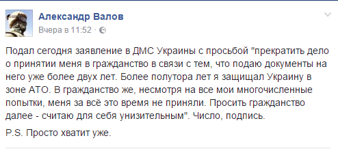 "Подал сегодня заявление в ГМС Украины с просьбой "прекратить дело о принятии меня в гражданство в связи с тем, что подаю документы на него уже более двух лет. Более полутора лет я защищал Украину в зоне АТО. В гражданство же, несмотря на все мои многочисленные попытки, меня за всё это время не приняли. Просить гражданство далее - считаю для себя унизительным". Число, подпись. Просто хватит уже", - написал он.