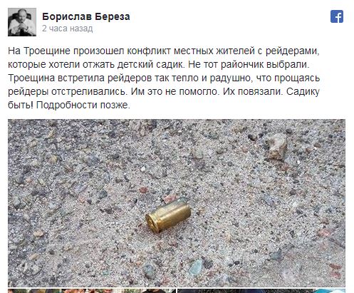 Депутат Борислав Береза при этом написал в своем Facebook, что на Троещине возник конфликт с рейдерами, которые хотели "отжать" детский садик. Этому якобы помешали активисты.