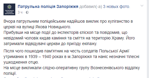 В Запорожье вчера, 16 августа, мужчина повредил памятник возле католического храма на улице Якова Новицкого. Об этом сообщает пресс-служба патрульной полиции.