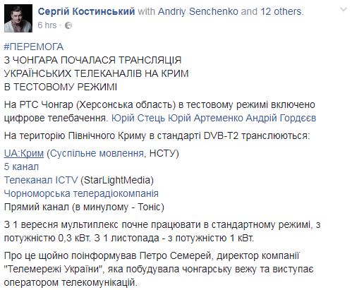 "На РТС Чонгар (Херсонская область) в тестовом режиме включено цифровое телевидение. На территорию Северного Крыма в стандарте DVB-T2 транслируются "UA: КРЫМ" (НСТУ), "5 канал", "Прямой канал" (Тонис), ICTV, "Черноморская ТРК", - написал Костинский.