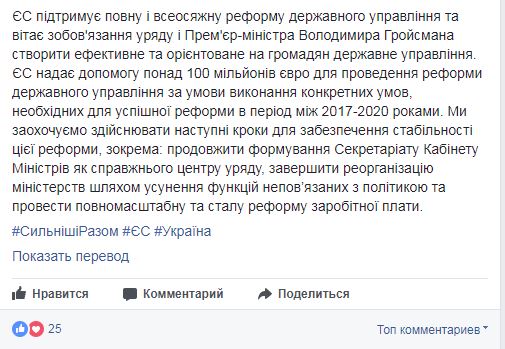 "ЕС оказывает помощь - более 100 миллионов евро - для проведения реформы государственного управления при условии выполнения конкретных условий, необходимых для успешной реформы в период между 2017-2020 годы", - сказано в сообщении.
