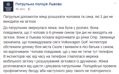Правоохранители отмечают, что к патрульным обратилась женщина, которая была в отчаянии. Она сообщила, что ее муж с 6-летним сыном три дня не выходят на связь. Они из Львова уехали отдыхать к реке Опир.