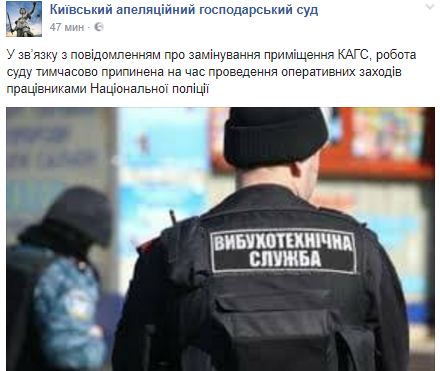 В Киеве сообщили о заминировании Киевского апелляционного хозяйственного суда, работа которого приостановлена. Об этом пресс-служба КАХС написала в Facebook.