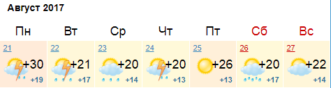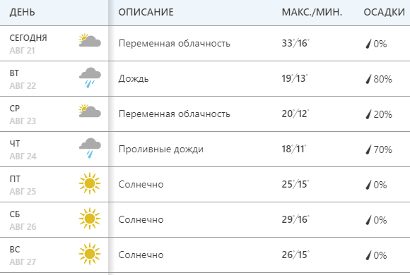 Ресурс Мeteoprog.ua также пишет, что с +32 в понедельник температура упадет до +18...+24 в середине недели и вновь поднимется к отметке +31 только в воскресенье. Дожди прогнозируют 22, 24 августа и на выходных 26-27-го.