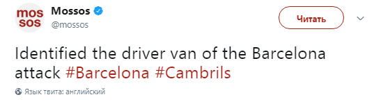 Каталонская полиция заявила, что установила личность террориста, который был за рулем минивэна, въехавшего в толпу пешеходов в Барселоне. Об этом правоохранители сообщили в Twitter.