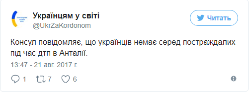 "Консул сообщает, что украинский среди пострадавших в ДТП в Анталии", - говорится в сообщении.