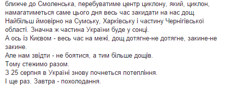 "Словом, погода будет нежаркой, даже скорее свежей, +20 - +25, на севере, включая Киев, +17 - +23 градуса. Дождь больше всего интересует в столице, это понятно и логично. Потому что - столица, потому что парад, потому что много мероприятий торжественных и просто хороших. 24 августа на северо-восток от Украины, едва не над Москвой, но ближе к Смоленску, будет находиться центр циклона, который, циклон, будет пытаться именно в этот день все время забрасывать на нас дождь. Наиболее вероятно на Сумскую, Харьковскую и часть Черниговской области. Значительная же часть Украины будет в солнце. А вот с Киевом - все время на грани, дождь дотянет-не дотянет, забросит-не упрекнет", - рассказала Диденко.