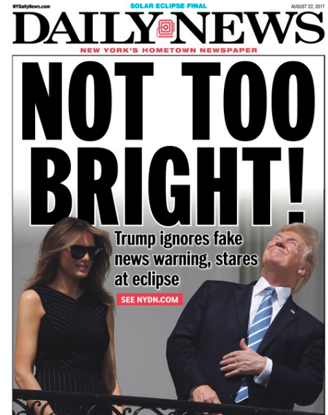 Фотографии Трампа без очков вызвали ироническую реакцию в соцсетях, а газета Daily News раскритиковала президента заголовком с игрой слов "Not Too Bright!", который можно перевести и как "Не слишком ярко", и как "Не слишком умный".