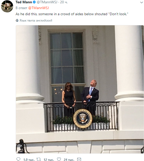 Фотографии свидетельствуют, что Трамп на некоторое время проигнорировал опасность явления для зрения и наблюдал за затмением без защитных очков, правда, впоследствии их же надел.