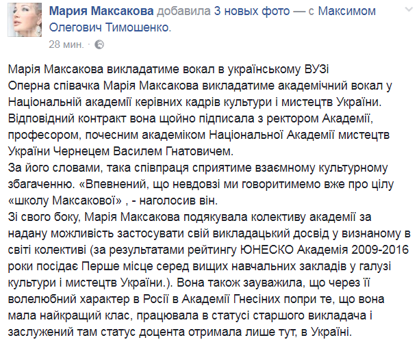 Экс-депутат Государственной думы России, супруга убитого Дениса Вороненкова и оперная певица Мария Максакова станет преподавательницей вокала в "Национальной академии руководящих кадров культуры и искусств Украины".