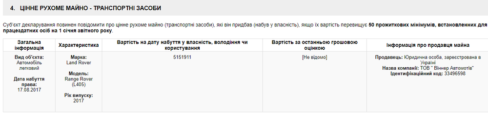 Микитась приобрел комплектующие для автомобиля за 92 757 гривен. О каких именно атомобильных деталях говорится, в декларации не указывается.