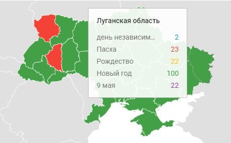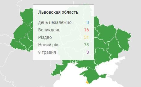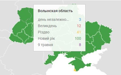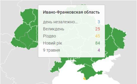 Мы сравнили популярность Дня независимости и перечисленных президентом праздников за 2016 год, добавив к общему списку 9 мая - День победы. В целом по Украине предпочтения разделились так:
