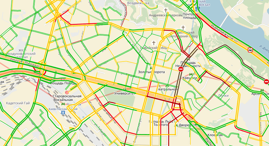 Традиционно трудно проехать по бульвару Шевченко, Большой Васильсковской, Льва Толстого, Шота Руставели, Рогнединской, Бассейной.