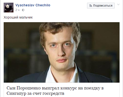 "Для тех, кто не верит, что главная черта Пётра Алексеевича - это жадность: есть прекрасная новость. Сын Порошенко выиграл конкурс на поездку в Сингапур за счет госсредств", - пишет журналист Александр Дубинский.