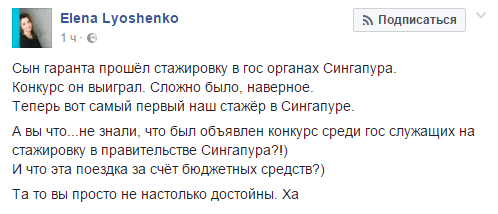 "Сын гаранта прошёл стажировку в гос органах Сингапура. Конкурс он выиграл. Сложно было, наверное. Теперь вот самый первый наш стажёр в Сингапуре. А вы что...не знали, что был объявлен конкурс среди гос служащих на стажировку в правительстве Сингапура?!)