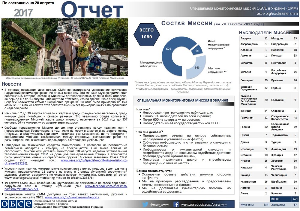 В том числе, идет речь об угрозах и запугиваниях, которые также применялись с целью подорвать деятельность Миссии: 13 августа на мосту в Станице Луганской (под контролем Киева) вооруженный мужчина угрожал выстрелить по членам патруля Миссии.