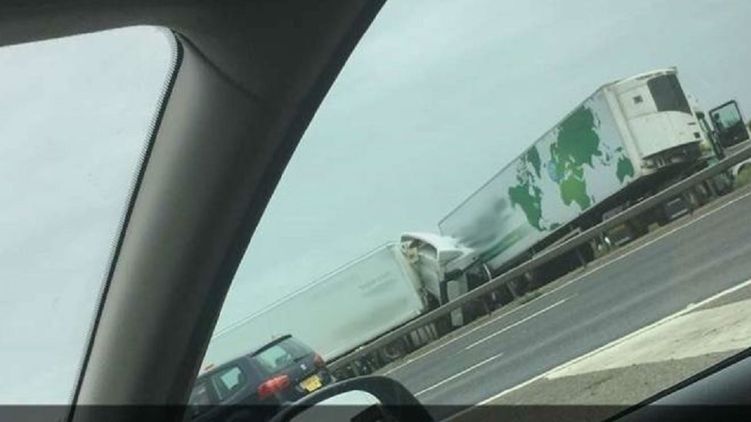 Микроавтобус буквально сплющило между грузовиками Фото: TWITTER/@ITSOLLIEYT