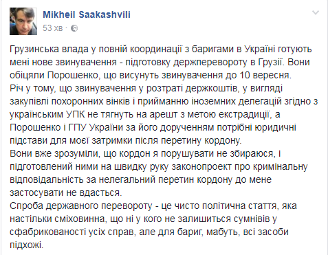 "Грузинские власти в полной координации с барыгами в Украине готовят мне новое обвинение - подготовку госпереворота в Грузии. Они обещали Порошенко, что выдвинут обвинение до 10 сентября. Дело в том, что обвинения в растрате госсредств, в виде закупки похоронных венков и приема иностранных делегаций по украинскому УПК не тянут на арест с целью экстрадиции, а Порошенко и ГПУ Украины по его поручению нужны юридические основания для моего задержания после пересечения границы. Они уже поняли, что границу я нарушать не собираюсь, и подготовленный ими на скорую руку законопроект об уголовной ответственности за нелегальное пересечение границы ко мне применить не удастся. Попытка госпереворота - это чисто политическая статья, которая настолько смехотворна, что ни у кого не останется сомнений в сфабрикованности всех дел, но для барыг, видимо, все средства хороши", - написал Михаил Саакашвили.
